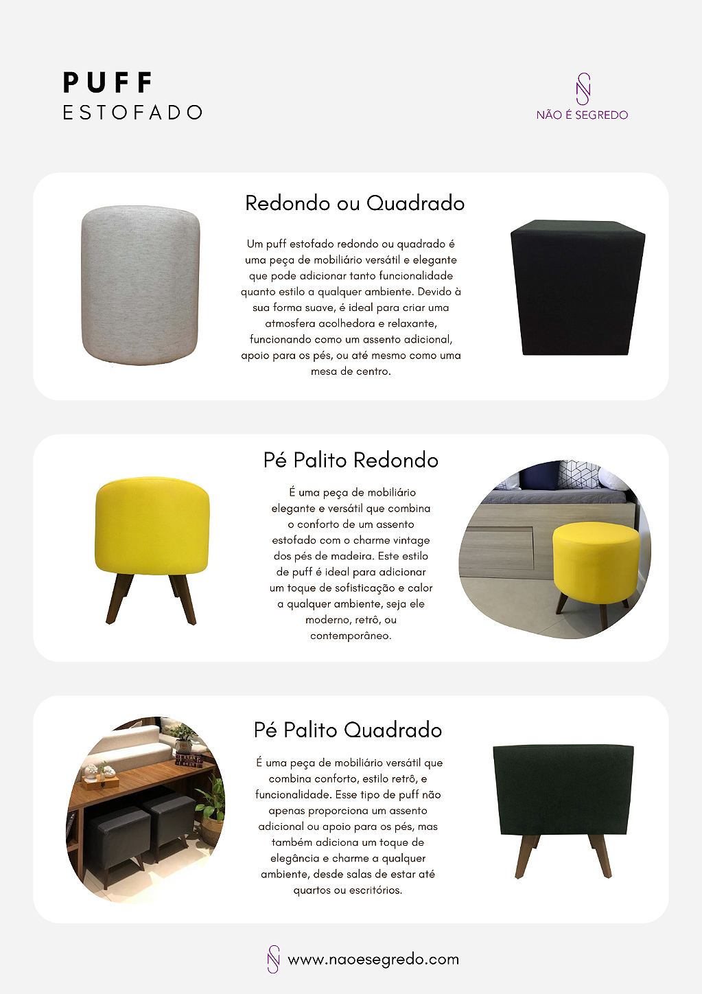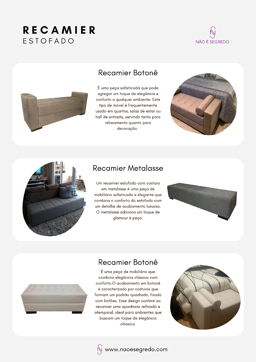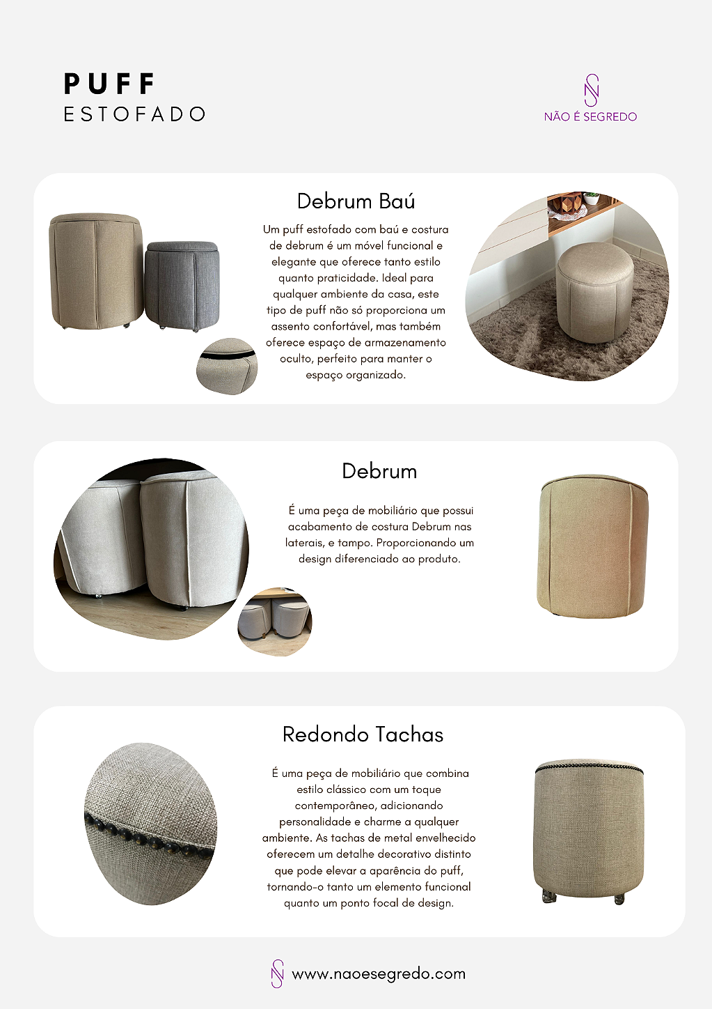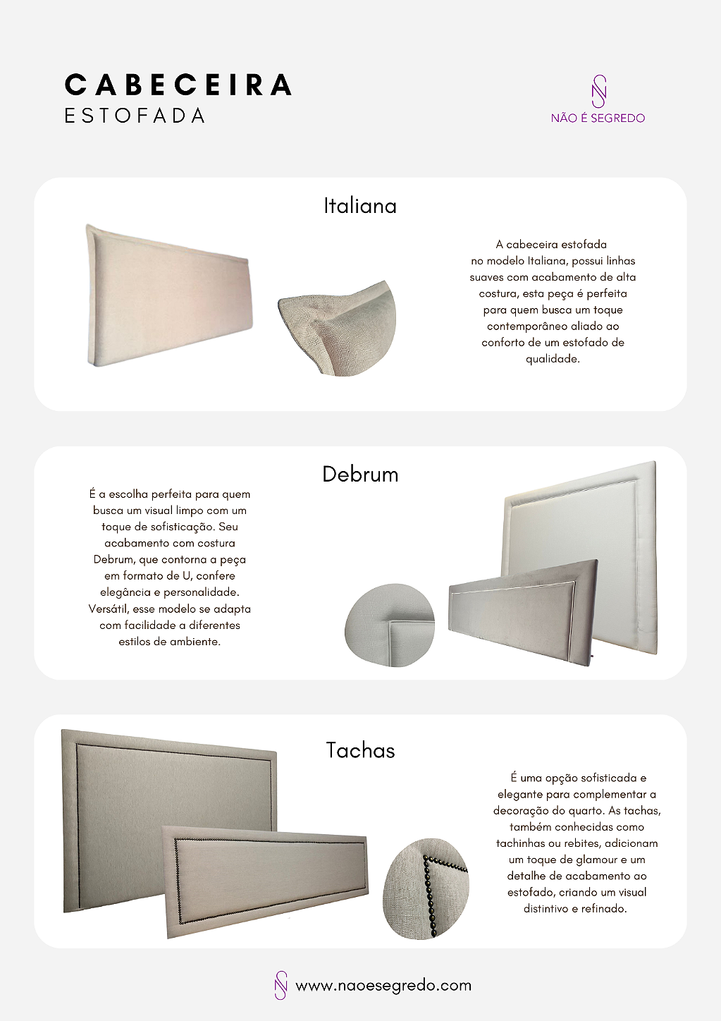 A Não é Segredo é referência no segmento de mobiliário estofado e decoração de alta qualidade, transformando ambientes com design, conforto e durabilidade excepcionais. Especializada na criação de peças que vão desde cabeceiras, puffs, recamier, vasos, floreiras rústicas e uma infinita variedade de tecidos e cores. Nossa missão é criar espaços únicos, onde cada peça reflete a personalidade e o estilo do cliente, combinando funcionalidade e estética de forma harmoniosa.