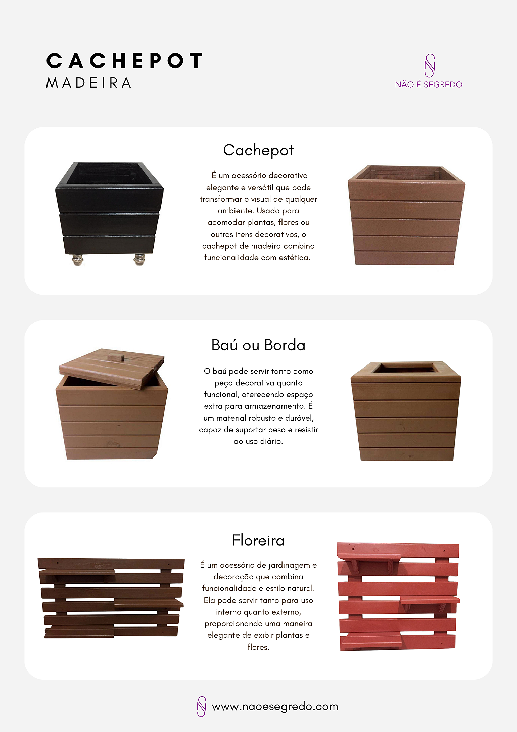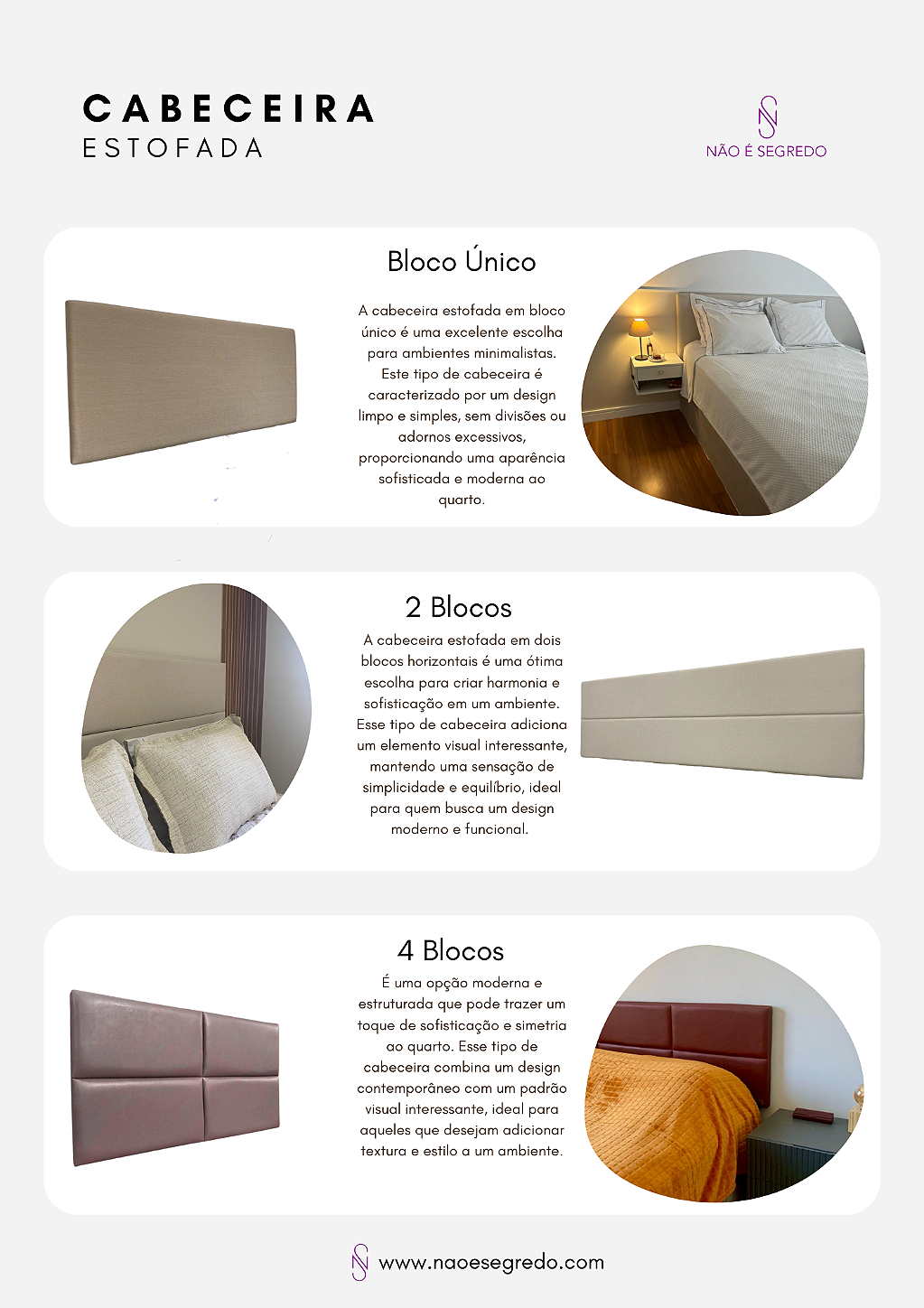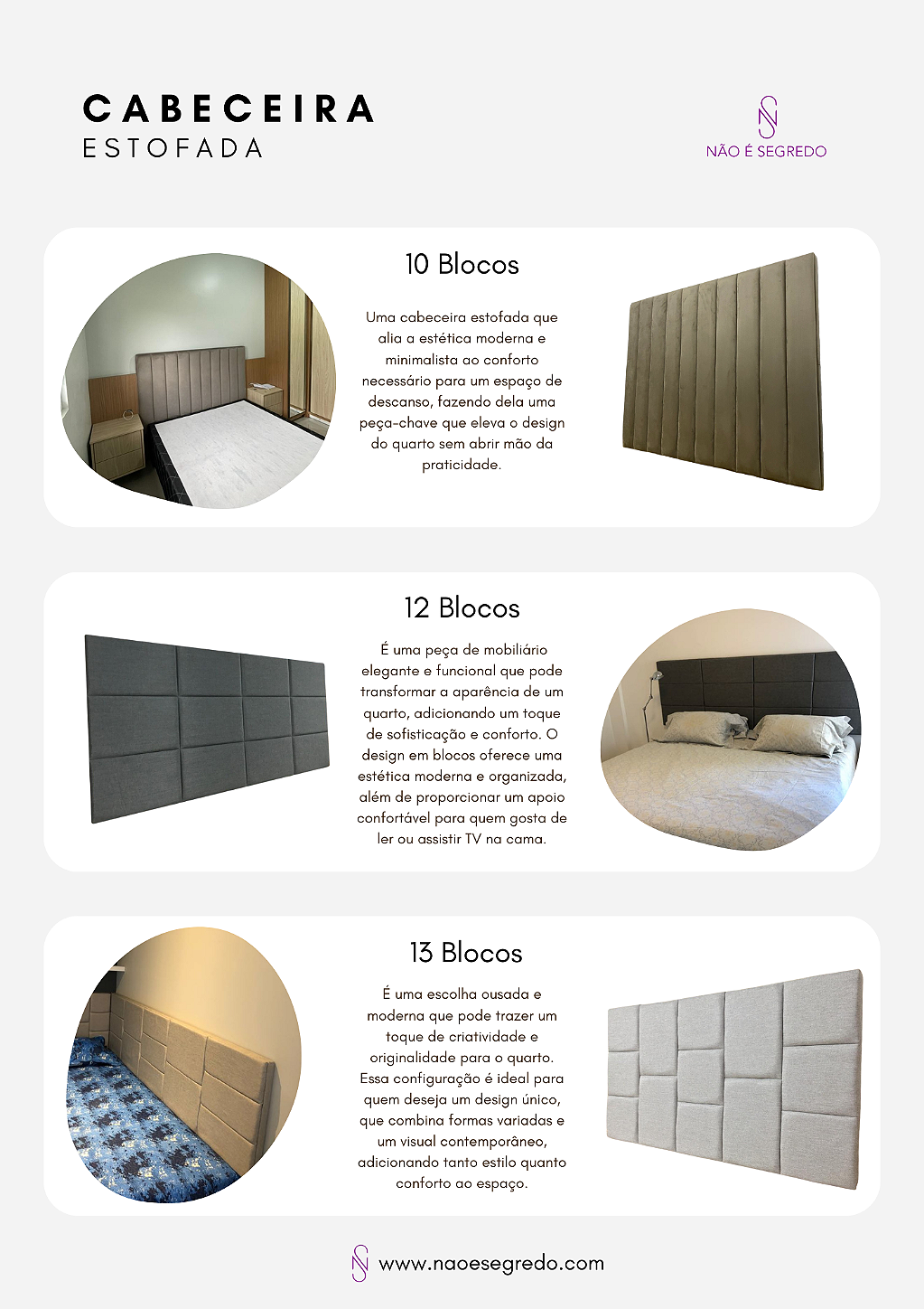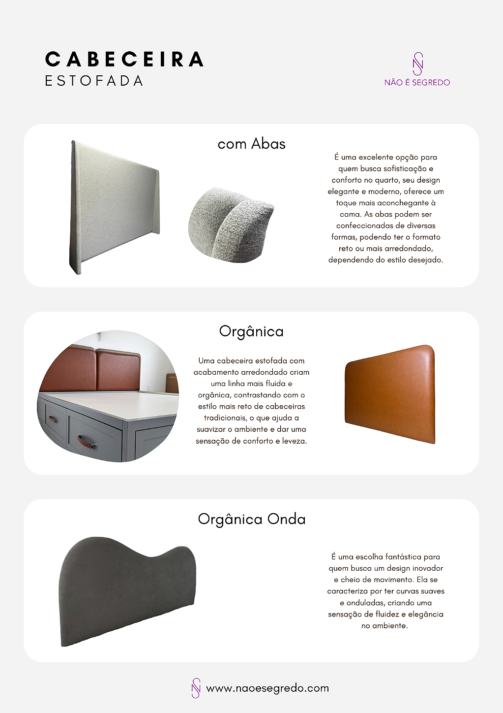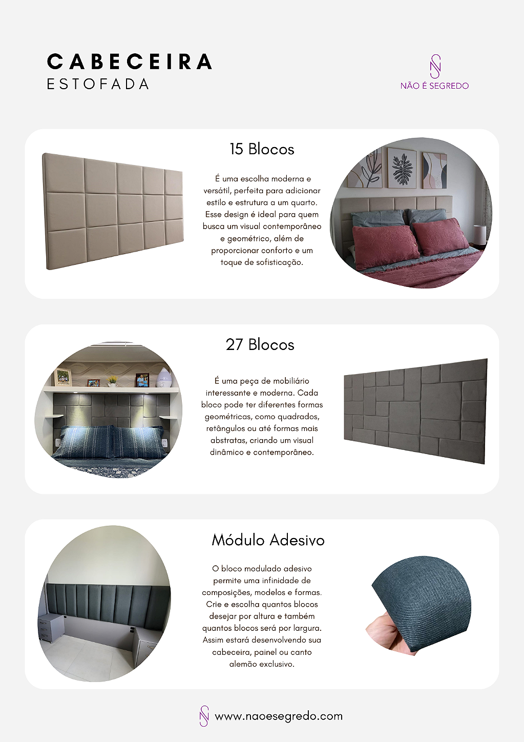 A Não é Segredo é referência no segmento de mobiliário estofado e decoração de alta qualidade, transformando ambientes com design, conforto e durabilidade excepcionais. Especializada na criação de peças que vão desde cabeceiras, puffs, recamier, vasos, floreiras rústicas e uma infinita variedade de tecidos e cores. Nossa missão é criar espaços únicos, onde cada peça reflete a personalidade e o estilo do cliente, combinando funcionalidade e estética de forma harmoniosa.